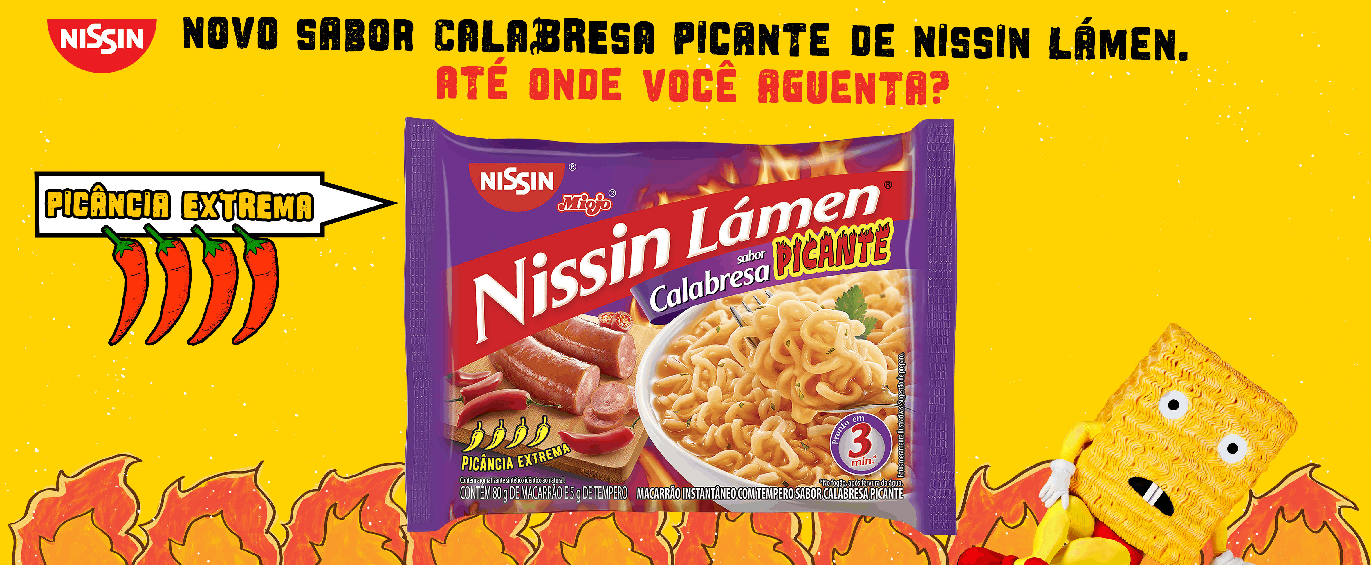 Ingredientes do macarrão: farinha de trigo enriquecida com ferro e ácido fólico, gordura vegetal, sal, reguladores de acidez carbonato de potássio e carbonato de sódio, estabilizantes trifosfato pentassódico, difosfato tetrassódico e di-hidrogenofosfato de sódio e corante beta-caroteno sintético.